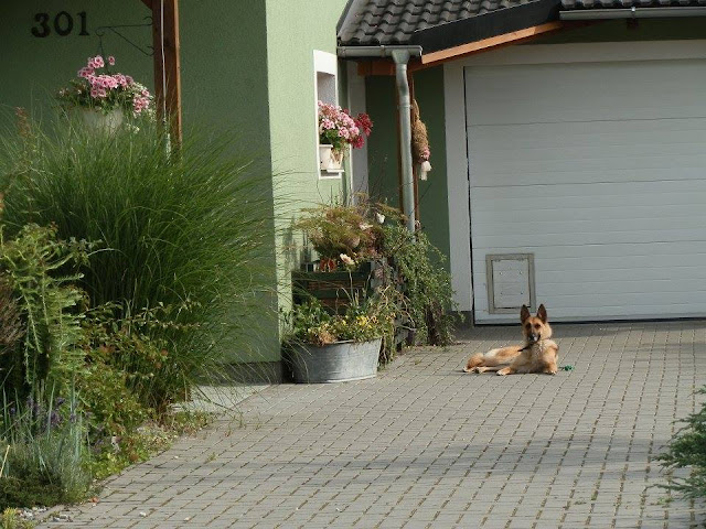 Pod nimi osázené nádoby všeho druhu – bývalý zavařovací hrnec jsem koupila za pár korun přes bazar a pak natřela na červeno, terakotové květináče a také několik vlastnoručně vyrobených květináčů z hypertufy, které však na fotce nejdou vidět.