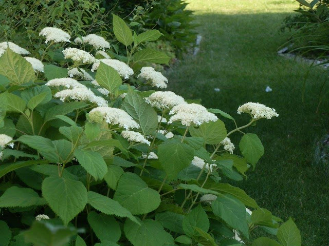Hortenzie stromečkovitá ještě jednou. Stále ji mnoho lidí v mém okolí nezná, podobně jako hortenzii latnatou a sází spíše na známější hortenzie velkolisté. Při tom jsou ve srovnání s ní méně náročné, mohou být pěstovány na sluníčku a neuškodí jim ani zimní a pozdně jarní mrazíky, protože kvetou na letorostech a na jaře se poměrně výrazně řežou.