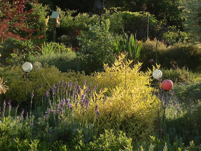 Kromě již zmiňovaných obyvatel našeho „levandulového políčka“ zde bydlí i dva ořechoplodce klandonské „Worcester Gold“ – na fotce žlutozeleně zbarvený nižší keřík. Dříve zmiňovaná perovskie je polokeř v zadní části kvetoucí modrofialově. V tomto období si zde velmi užívám vzrušující barevné kombinace žluté a modrofialové.