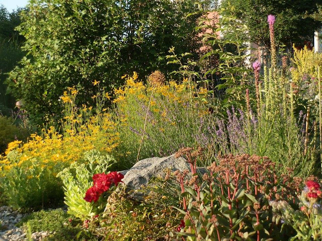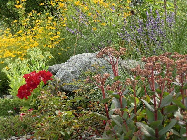 Pohled z opačné strany do „levandulového“ políčka – rochodníkovce nachového „Matrona“ s půdopokryvnou růží v pravém spodním rohu jsem již zmiňovala, u kamene rostou další rozchodníkovce nachové („Herbstfreude“), žluté květy patří krásnoočku přeslenitému, za nimi pak keř kaliny vrásčitolisté, kterou jsem již zmiňovala, podobně i žlutozelené květy kontryhelu či ořechoplodce. Zbývá doplnit identitu stromu s kulovitou korunou v dáli – je to další z našich akátů (Robinia pseudoacacia „Umbraculifera“).