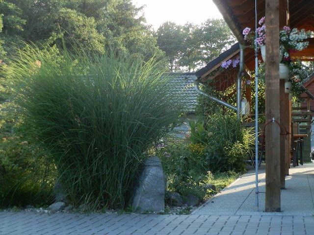 Ozdobnice čínská „Gracillimus“ a také naše letošní osázení závěsných květináčů balkónovkami (dlouhodobou a osvědčenou stálicí jsou u nás vzpřímené muškáty, které jsem letos podsadila bílou vějířovkou (rovněž na ni nedám dopustit) a drobnokvětou bílou bakopou.