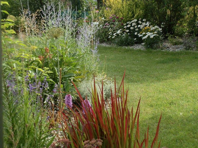 Červenolistý lalang válcovitý „Red Baron“ jsem již zmiňovala, podobně růžovokvětou šuškardu či svatolinu cypříškovou s šedivými listy či vyšší modrofialově kvetoucí perovskii.
