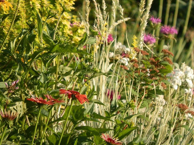 Rudbeckie vlevo nahoře teprve začínají nakvétat, červenokvěté třapatky nachové však už svou krásu dávají na obdiv, růžovofialové květy v dáli patří monardě, drobné bílé květy mému oblíbenému řebříčku bertrámu – vypadá skvěle v kyticích z živých i sušených květin.