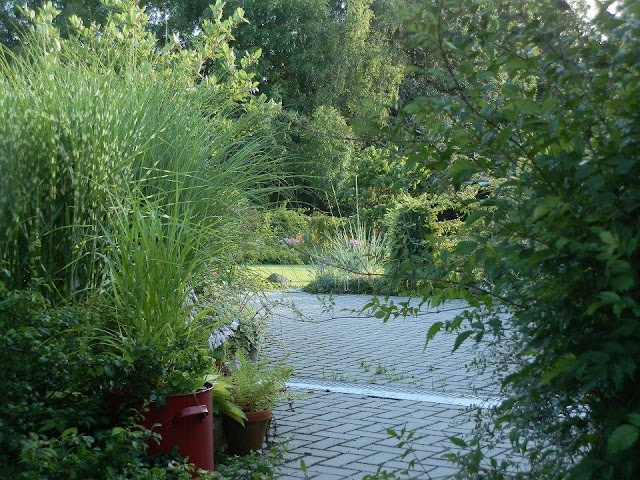 Opět výhled směrem k místům, odkud jsme vyšli. V dáli jsou vidět denivky plavé či hortenzie stromečkovitá. Před nimi pak roste do krásy platan javorolistý ‚Alphens Globe‘. Vzpomínáte? .-)