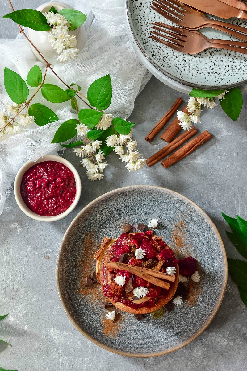 Lívance naskládáme na sebe a přelijeme malinovou omáčkou. Nakonec ozdobíme malinami, čokoládou a zasypeme trochou skořice.