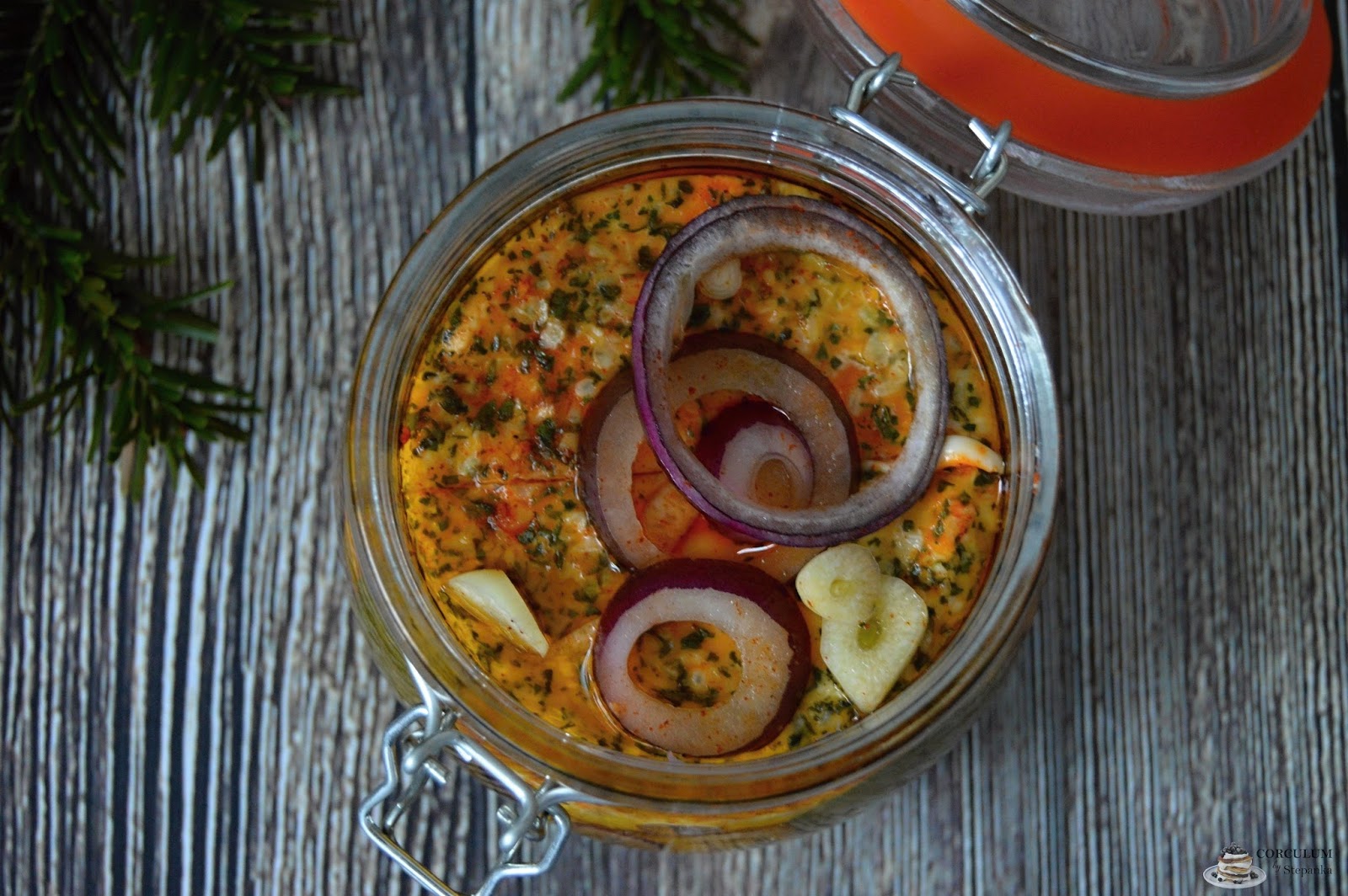 Zbývá již jen vtlačit do sklenice druhý sýr, poklást ho cibulí a dobře zalít až po okraj olivovým olejem. Uzavřenou sklenici s připravenými sýry uchováváme v lednici po několik týdnů až měsíc (v závislosti na trvanlivosti hermelínu). Pokud máte rádi hermelín tvrdší, doporučuji sníst již po týdnu marinování. Můj tatínek naopak vyhledává sýry těsně po záruce, kdy jsou vyzrálé („přezrálé“) a tehdy teprve oceníte vzduchotěsný uzávěr… Dobrou chuť!