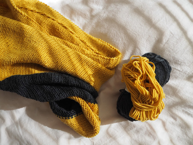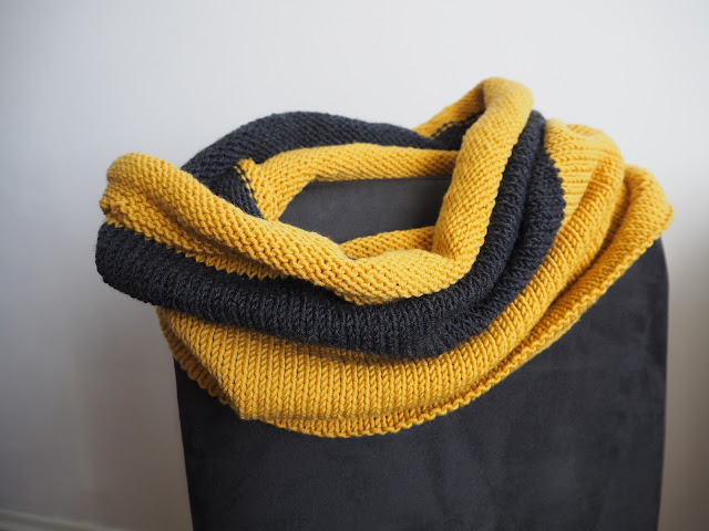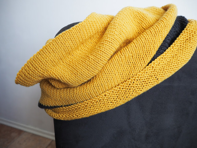 větrnou neděli jsem využila i k pletení – jak jinak u pohádky ?. Chtěla jsem dokončit žlutý nákrčník k čepici, o které jsem psala tady. Mám hotovo. Ke žluté jsem přidala i pruh šedé …