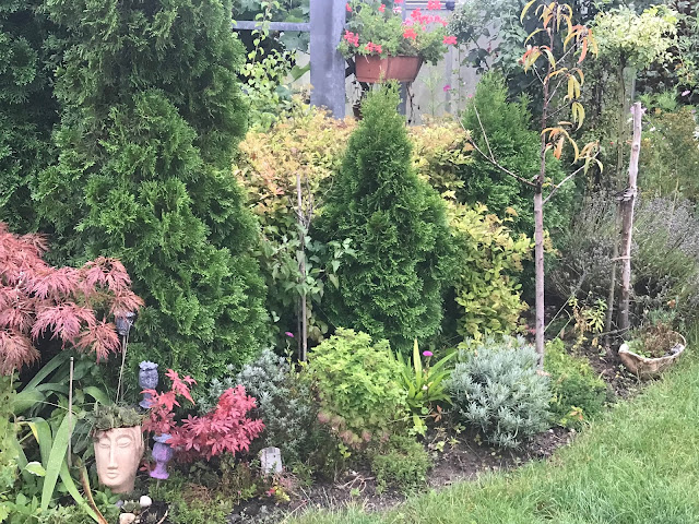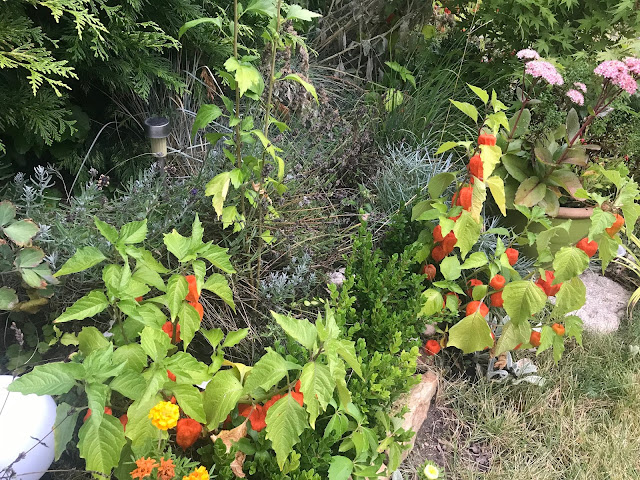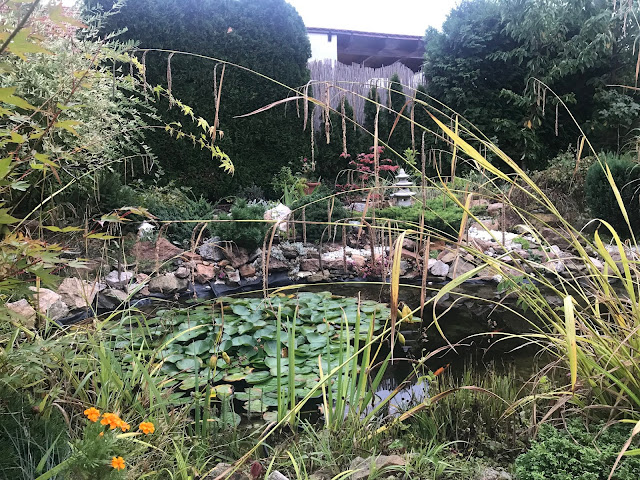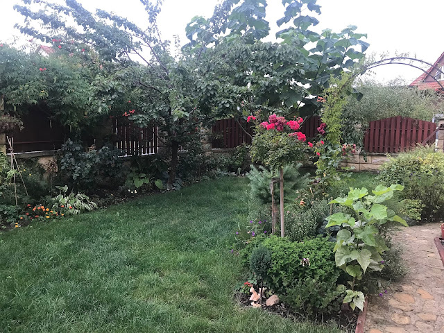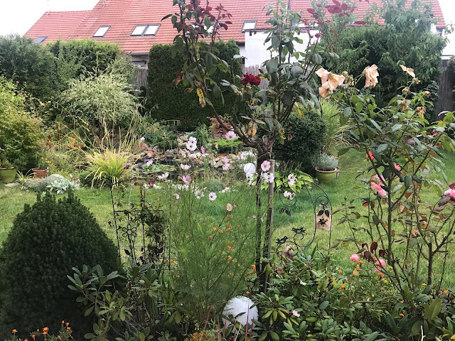 Pomalu, ale jistě zahrada odkvétá. Kupodivu, letošní léto nebylo tak žhavé jako v minulém roce, a tak přežil trávník a trvalky a traviny se rozrostly do větších trsů. Stromky a keře bujně povyrostly. Proti hrabošům (aktuální "žhavé" mediální téma) používám přírodní prostředek, zahradního predátora... kočku. Už její pouhá přítomnost odradí zástupy hladových hrabošů, takže se zatím hraboši usadili v zahradním kompostéru. Zásobuji je slupkami z melounů a jinými dobrotami a doufám, že se nepustí do dýní hokaidó, které mám ještě na záhonu a dozrávajících hroznů. Pár fotek z rána, celou noc pršelo, tak je vše takové upršené...