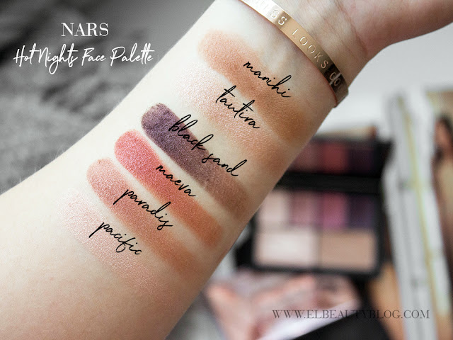 Mezi letními novinkami jsou kromě mini paletek se stíny také dvě větší paletky. Já mám doma *Hot Nights Face Palette. Nejdete v ní čtyři stíny, rozjasňující tvářenku a bronzer v teplých, víceméně neutrálních odstínech. Textura je podobná paletce tvářenek, na dotek jsou pudry jemné a velmi hladké. Prášení je minimální, pigmentace vysoká a textura na pleti velmi hladká a rovnoměrná. Všechny čtyři stíny jsou saténově lesklé.