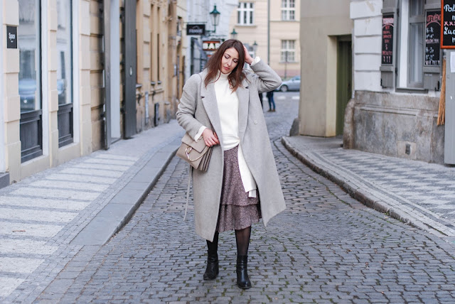 Já vážně netuším, jak to ostatní blogerky dělají, že fotí v zimě ty stylové outfity v holých nohách, a přitom to vypadá, že jim není zima. Pokud to tedy nefotí někdy brzo na podzim. Já jsem jako ratlík, musím mít dvacet vrstev a mám zmrzlé ruce. Ještě, že mám nalakované nehty. Ale nechci dneska psát o svém outfitu. Ten si zhodnoťte sami. Je to zimní inspirace, jak vytáhnou občas místo kalhot i sukně. Všechno v jemných tónech, které mám úplně nejradši.