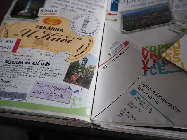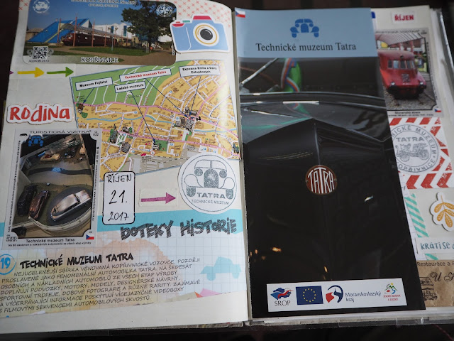 … chvíli jsme lepili do cestovních deníků. Ze sobotní návštěvy muzea v Kopřivnici jsme si totiž přivezli každý své čtyři nálepky a čtyři razítka – zatím nejvíc z jednoho výletu – sběratelé pochopí ?. Vlastně jsem je kupovali všichni. Marek s Nikčou mají jeden společný deník, my s Bertíkem každý svůj a Adam si právě takový sešit založil – další „lepící oběť“ ?…