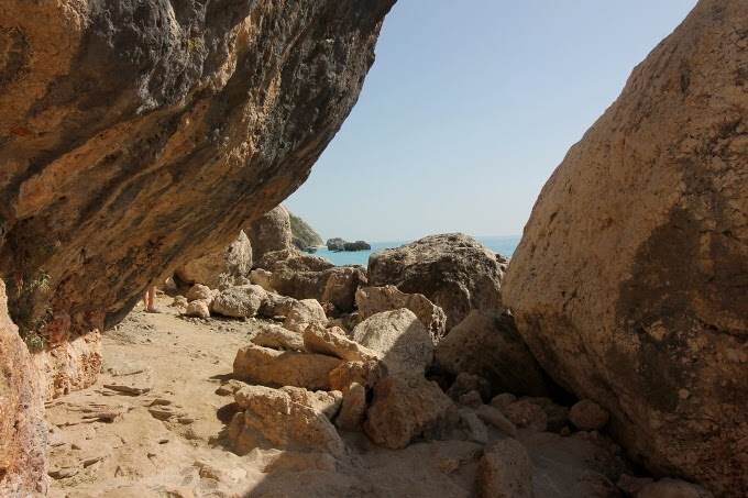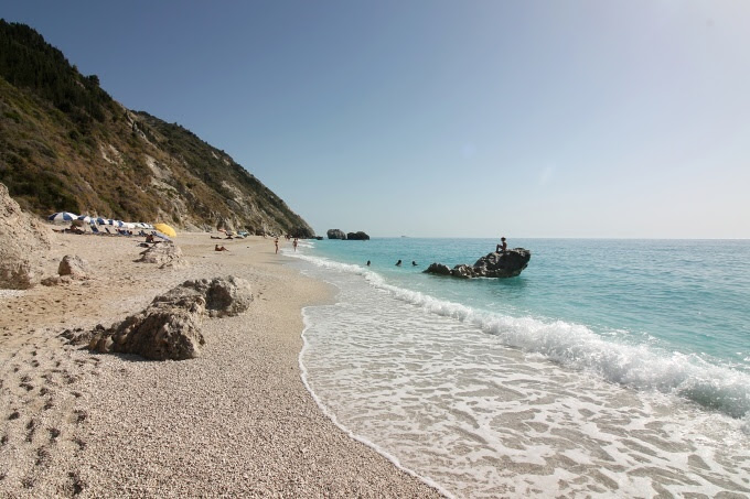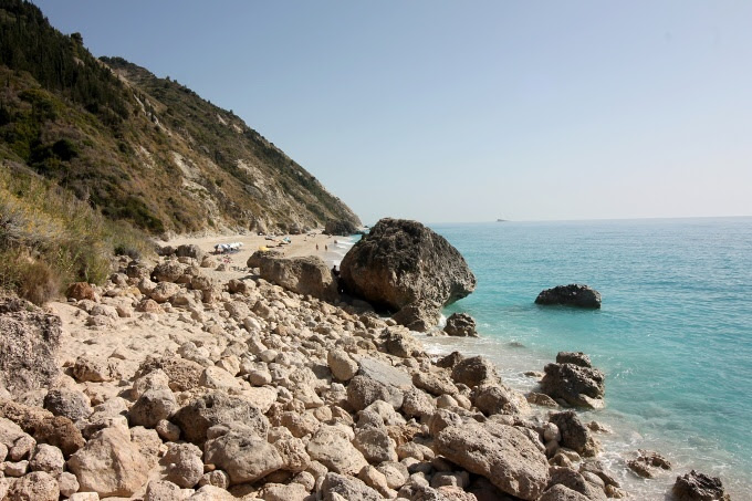 Pláž, na kterou se dostanete jedině po svých nebo lodí, se nachází kousíček od Agios Nikitas. Stačí se vyškrabat na útes a pak zase sejít dolů nebo si najmout vodní taxi (tedy pokud zrovna nejsou moc velké vlny). Konec pláže je nudistický, na začátku ale najdete i „textiláky“. :)) Pláž je dlouhá a široká a náročný přístup se stará o to, že tu nikdy nebude hlava na hlavě. A s vlnami je spousta zábavy!