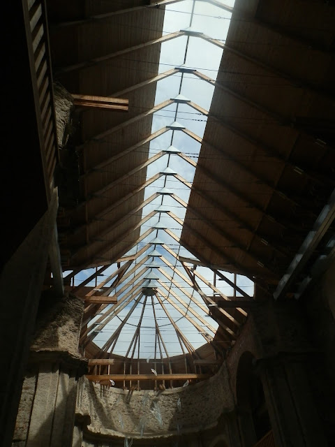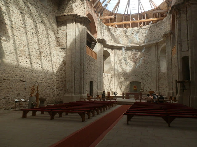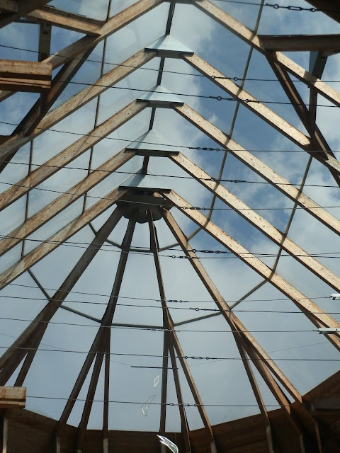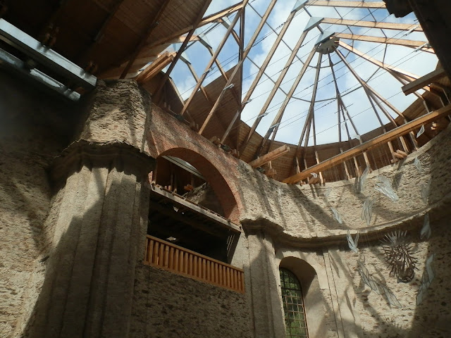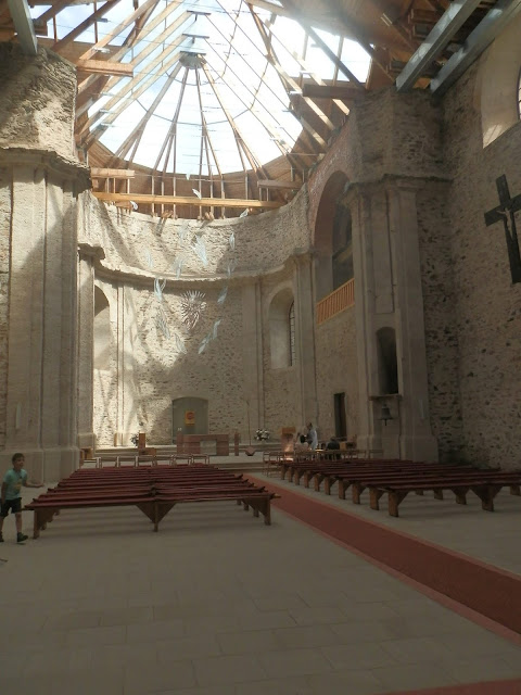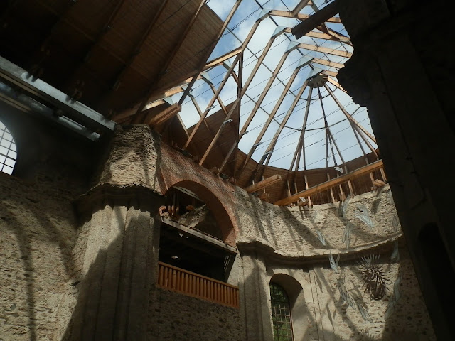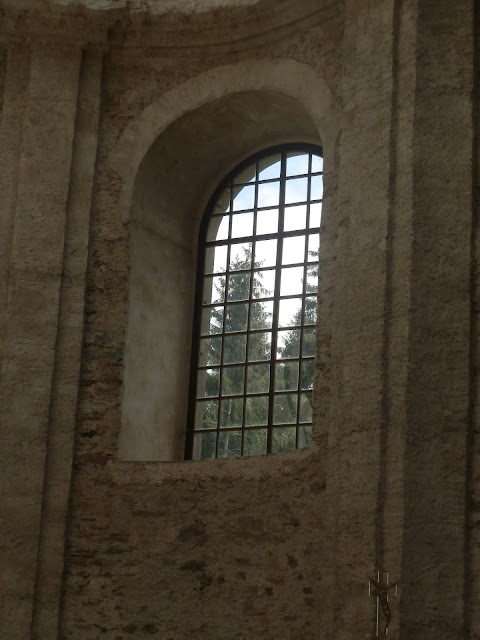 Kostel Nanebevzetí Panny Marie a jeho okolí v Neratově. Kostel se skleněnou střechou.