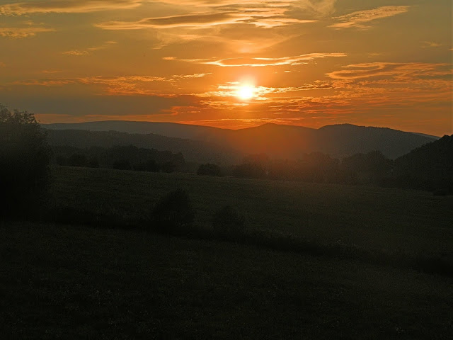 Večerní výhled z chalupy na samotě mezi podhorskými loukami.