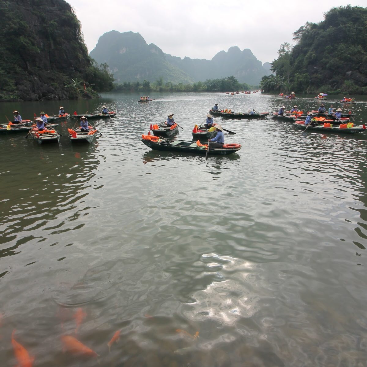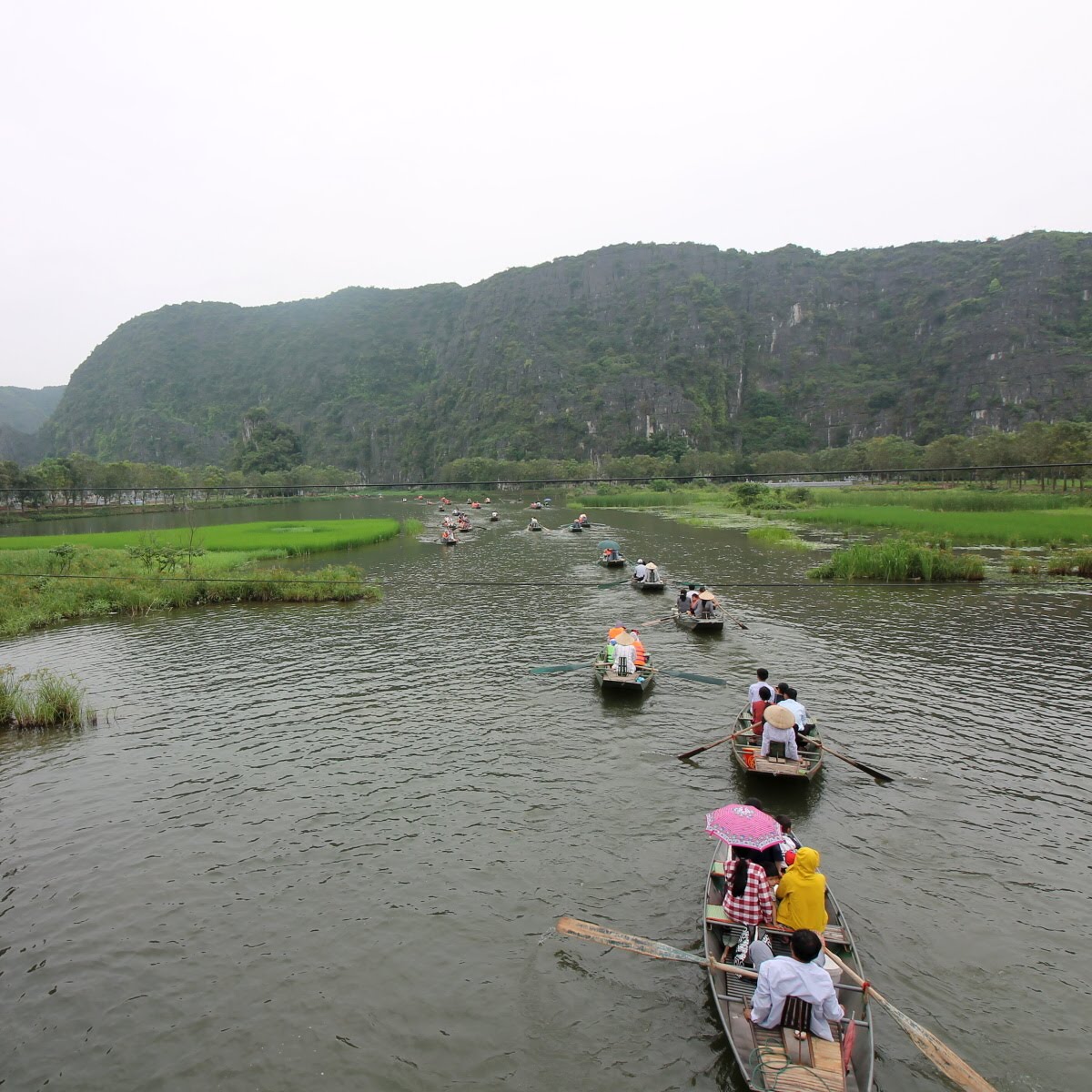 Po sprše a snídani jsme vyrazili na lodičky, na plavbu mezi rýžovými políčky a kopečky v Tam Coc za 390 000 VND pro oba. Byly tam hrozný davy právě kvůli prázdninám. Viditelnost teda nebyla nic moc, protože kousek odtud postavili cementárnu a tak to vypadalo, že je tu snad permanentní mlha. Na fotkách to vypadá jakoby pršelo, ale ty deštníky všichni měli proti sluníčku. Proplouvali jsme mezi rýžovými políčky a třemi jeskyněmi. Na konci nám prodavačky na loďkách pořád nutily něco pro pádlovače, že je strašně unavený, ale koupili jsme si jen mango za 20 000. Pádlovali tu opravdu zajímavě: nohama a opření o sedátko.