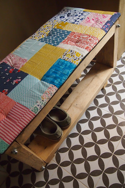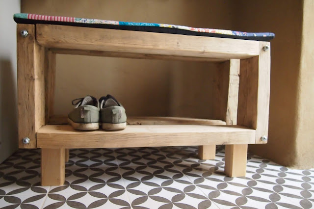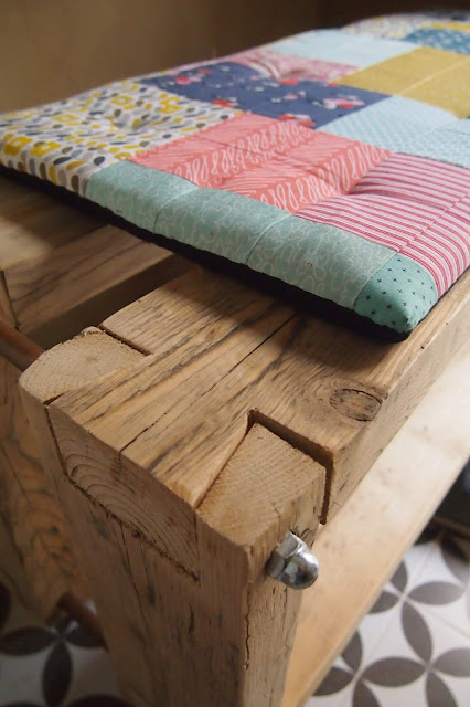 A tak vznikla nová lavice ze starého dřeva s podsedákem z barevných látek, takové naše společné dílo..