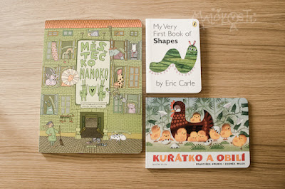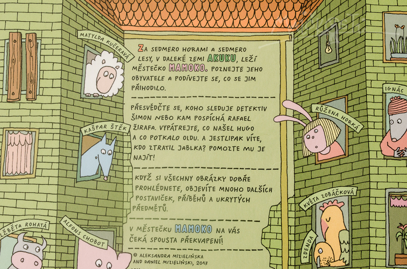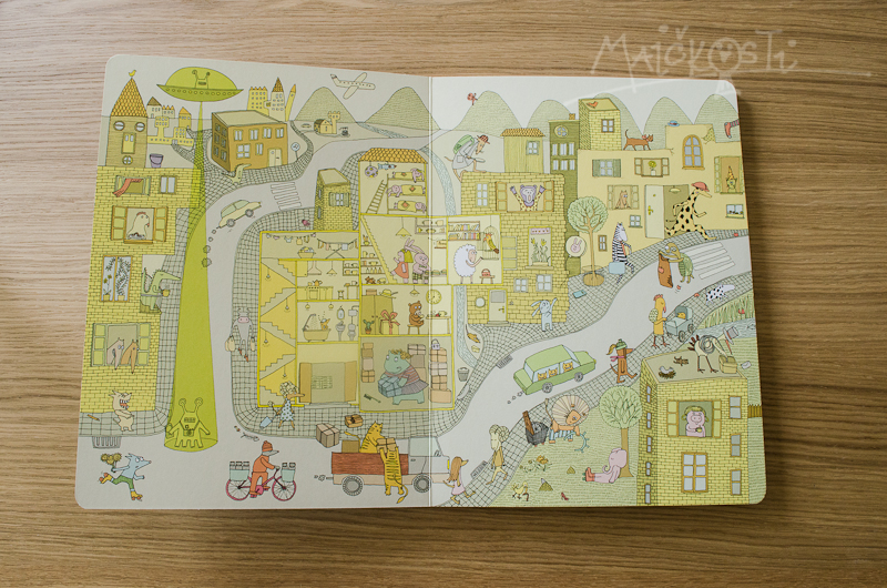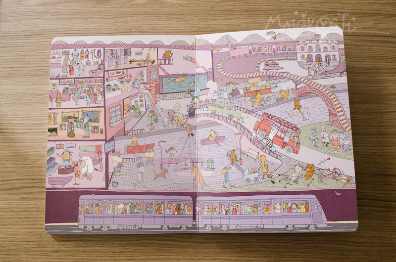 Tak tohle je zatím poslední kauf a myslím, že se moc povedl! Polské autory řada z vás bude jistě znát z profláklejšího díla Mapy, nebo novějších Pod vodou/Pod zemí, které u nás doma určitě také nesmí chybět, ale to až časem. Takže jako první tedy máme Městečko Mamoko. Knížka je to skvělá jednak proto, že obsahuje množství detailů, což Madla miluje – může hledat a popisovat, navíc vysvětluje fungování města – domy, ulice, silnice, parky, náměstí s obchody, staveniště, metro… a do třetice nabízí i příběh, a to přitom zcela bez textu: každá postava prožívá svůj den prostřednictvím jednotlivých stránek. Postupně zjišťujeme, kam míří a co tam bude dělat. Postav jsou v knize desítky, takže máte s dětmi o zábavu postaráno na dlouhou dobu. Přiznám se, že ilustrace nejsou tak úplně můj šálek čaje, já mám radši spíš takové ty retro a nebo kolážové, tady je to dost velká divočina a sama bych po ní zřejmě nesáhla, ale byla mi doporučena a jsem za to převelice ráda, protože jsme si ji s Madlou obě oblíbily. Takže za nás rozhodně ANO!
