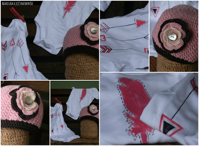Stáňa dopředu avizovala, ať to s dárečky nepřeháním, ale která tvořilka by se nechala ujít takovou příležitost alespoň trochu se vyřádit a přišla by s prázdnou, že? Připravila jsem tedy pro malou princeznu pár dárečků – háčkovanou čepičku (na které jsem si vyzkoušela nový pěkný, ale velmi jednoduchý vzorek) s kytičkou (návod případní zájemci najdou zde) a sadu tří bodýček vyzdobených barvami na textil.