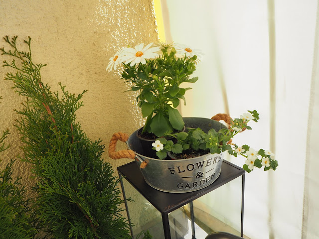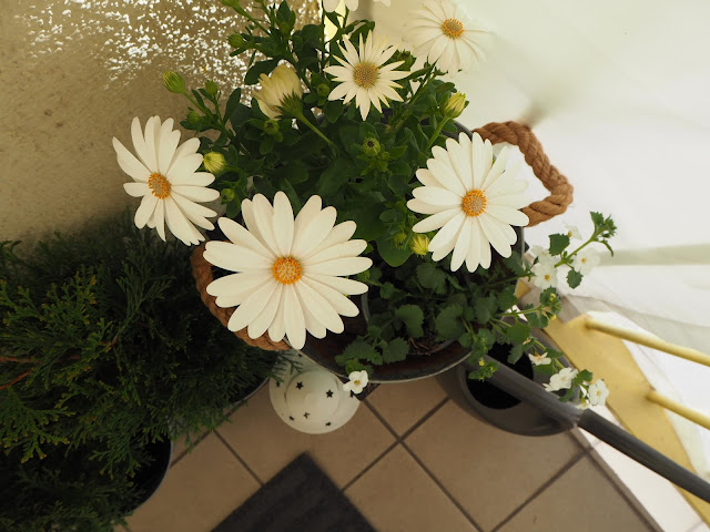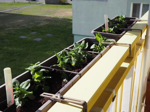 ... v truhlících jsou Surfinie. Měly by být bílé. Stejně jako ty loňské, které nakonec byly vínově červené, tak uvidíme jak to dopadne letos :-)) ...