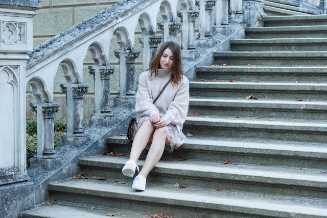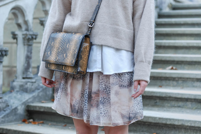 Tenhle outfit jsem vám na blogu ukazovala celkem nedávno. Našla jsem tuhle sukni v sekáči a rozhodla se jí trochu vylepšit. Pasuje vzorem perfektně k ledvince od Mum.ray, mají stejný vzor. A barevně to celé ladí do odstínů béžové, takže ten můj ikonický rolák byl jasnou volbou. A protože jsem tentokrát vynechala vykukující košily, vypadá svetr mnohem lépe zastrčený za okraj sukně.