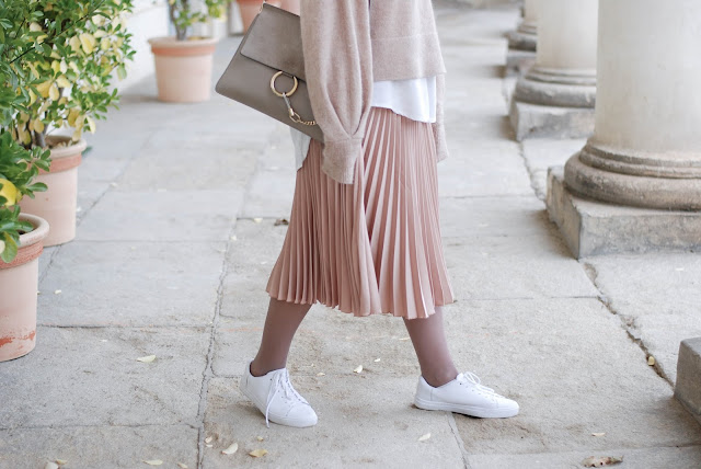 Zkuste si někdy béžovou namixovat s odstíny pudru a pastelové růžové. Pro mě super barevná paleta skvělá na jaro. Je to jemné, něžné, ale rozhodne ne přeslazené. Když se vám navíc podaří zkombinovat textury a délky, bude to pecka. Já v tomhle outfitu sáhla po vlně, plisované sukni a semiši na kabelce. Navíc jsem si tuhle kombinaci oblíbila natolik, že jsem si ji oblékla hned několikrát za sebou. Opět jsem nechala koukat bílou košili, vypadá to s ní zajímavěji.