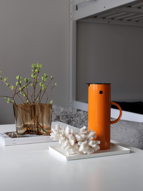 Každopádně toho, že jsem si vybrala tuto ikonickou konvici EM77 od Stelton (o které jsem psala už dříve zde) právě v této výrazné barvě, vážně nelituji. V těchto předjarních dnech dokáže pozvednout náladu. A sluší ji to nejen v pokoji dcery, ale i u jídelního stolu.