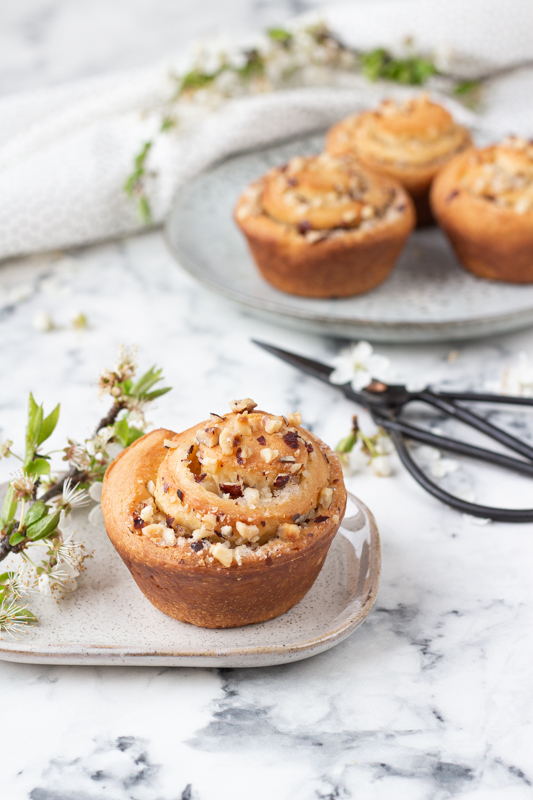 Vál si lehce poprášíme moukou, těsto rozválíme na obdélník cca 20 x 30 cm. Po celé ploše ho pomažeme máslem a posypeme cukrem smíchaným se skořicí a s oříšky (2 lžíce oříšků si dáme stranou). Necháme si pouze 2 cm volného okraje po jedné delší straně, který navlhčíme trochou vody. Potřený plát těsta zavineme jako roládu, navlhčený okraj pevně přitiskneme. Ostrým nožem roládu nakrájíme na 12 stejných kousků. Vložíme je řezem nahoru do formy na muffiny vymazané olejem, posypeme zbylými oříšky a necháme 30 minut dokynout na teplém místě.