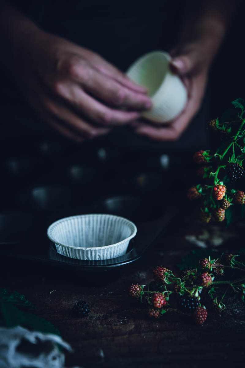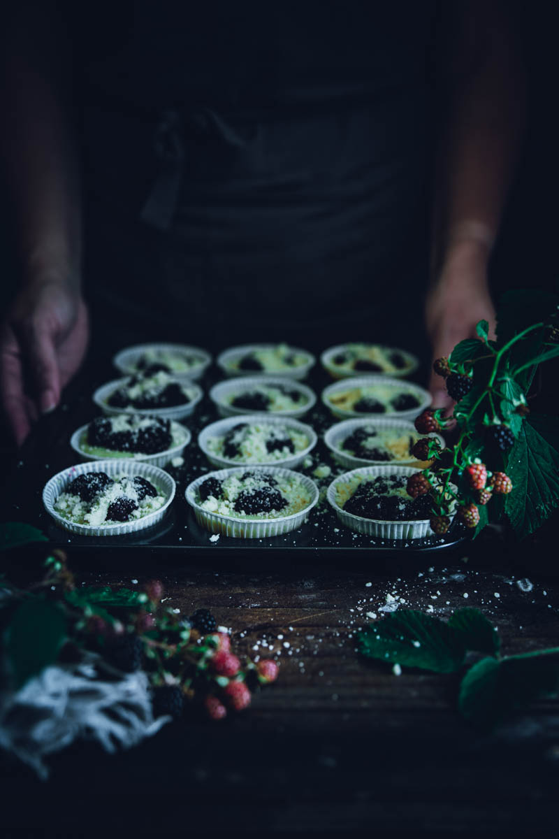 Do formy na muffiny si nachystáme papírové košíčky a rozdělíme rovnoměrně těsto. Poklademe ostružinami a nakonec posypeme posypkou, na kterou si smícháme cukr, mouku a máslo.