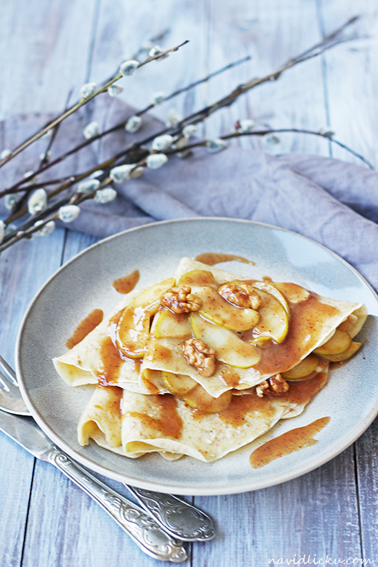 Jestli náhodou sledujete moje (velmi zřídka postované) Insta stories, tyhle palačinky už jste tam viděli. Tři týdny mi trvalo, než jsem si našla čas sepsat recept sem na blog. Čti: než jsem večer vydržela být vzhůru déle než dítě, které mě k počítači přes den sednout nenechá. Ale zpátky k receptu, chtěla jsem vyzkoušet něco nového, tak jsem tehdy do těsta přidala i jemně mleté vločky a překvapivě tahle varianta zachutnala i vybíravým členům rodiny. A protože jsem měla pocit, že by si ovesné palačinky zasloužily něco lepšího než marmeládu nebo nutellu, přidala jsem plátky jablek dušených ve skořici a smetanovém karamelu. Přiznám se ovšem, že pokaždé si se snídaní takhle nehraju, takže jestli zítra ráno budete hledět na fotku těhle palačinek a u toho smutně kousat do chleba se sýrem, nebudete v tom rozhodně sami.