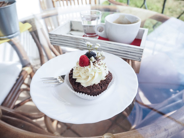 Kafé Fara. Čekala jsem tu jako obvykle fronty lidí před vchodem do restaurace, ale kupodivu v tu dobu tu bylo několik volných stolů. Během jídla nám začalo dost pršet, ale to nám nevadilo, protože pod slunečníkem bylo stále dobře.