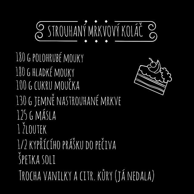 Páteční recept Zveřejněno uživatelem Spolu u stolu | 31. 01. 2020 | Na instagramu jsem slíbila na pátek recept na strouhaný mrkvový koláč. Takže... Já pekla z poloviční dávky, takže to byl takový drobeček přesně na malý podnos z Pepco. Mějte krásný víkend!Nás čeká rodinná oslava, tak bude veselo :-)Klárka