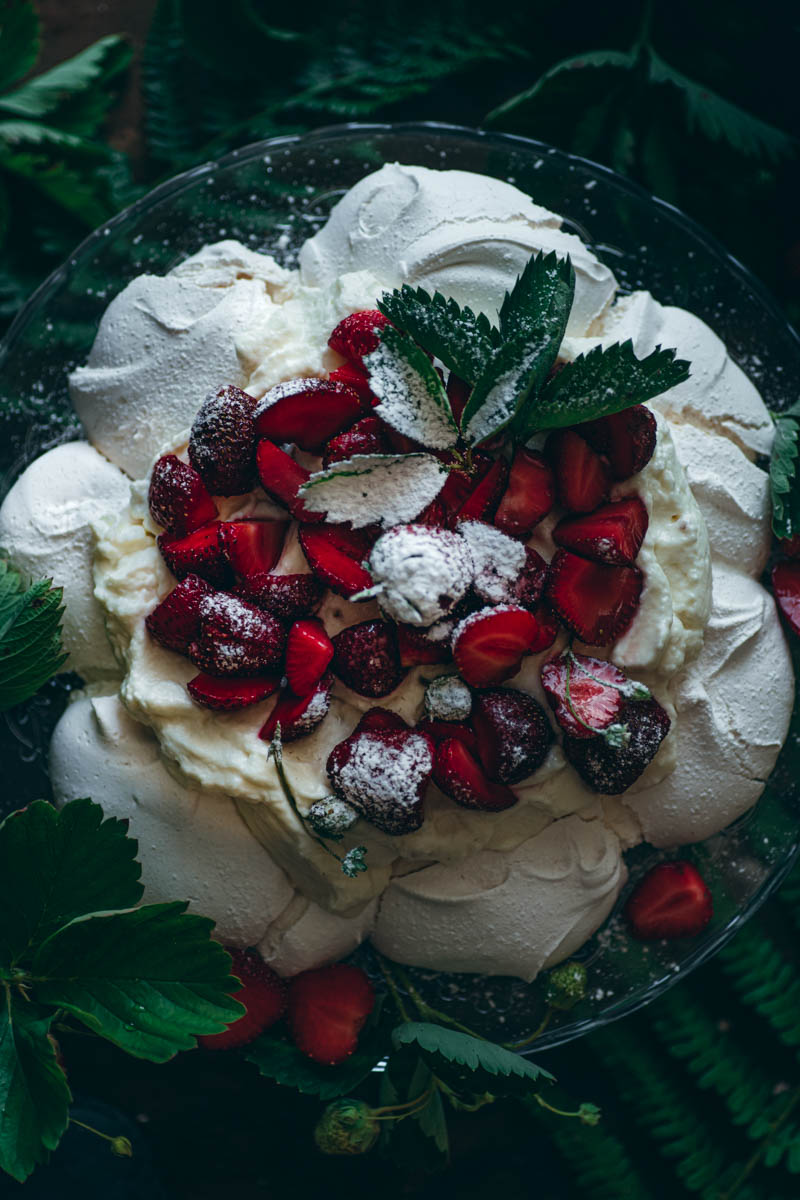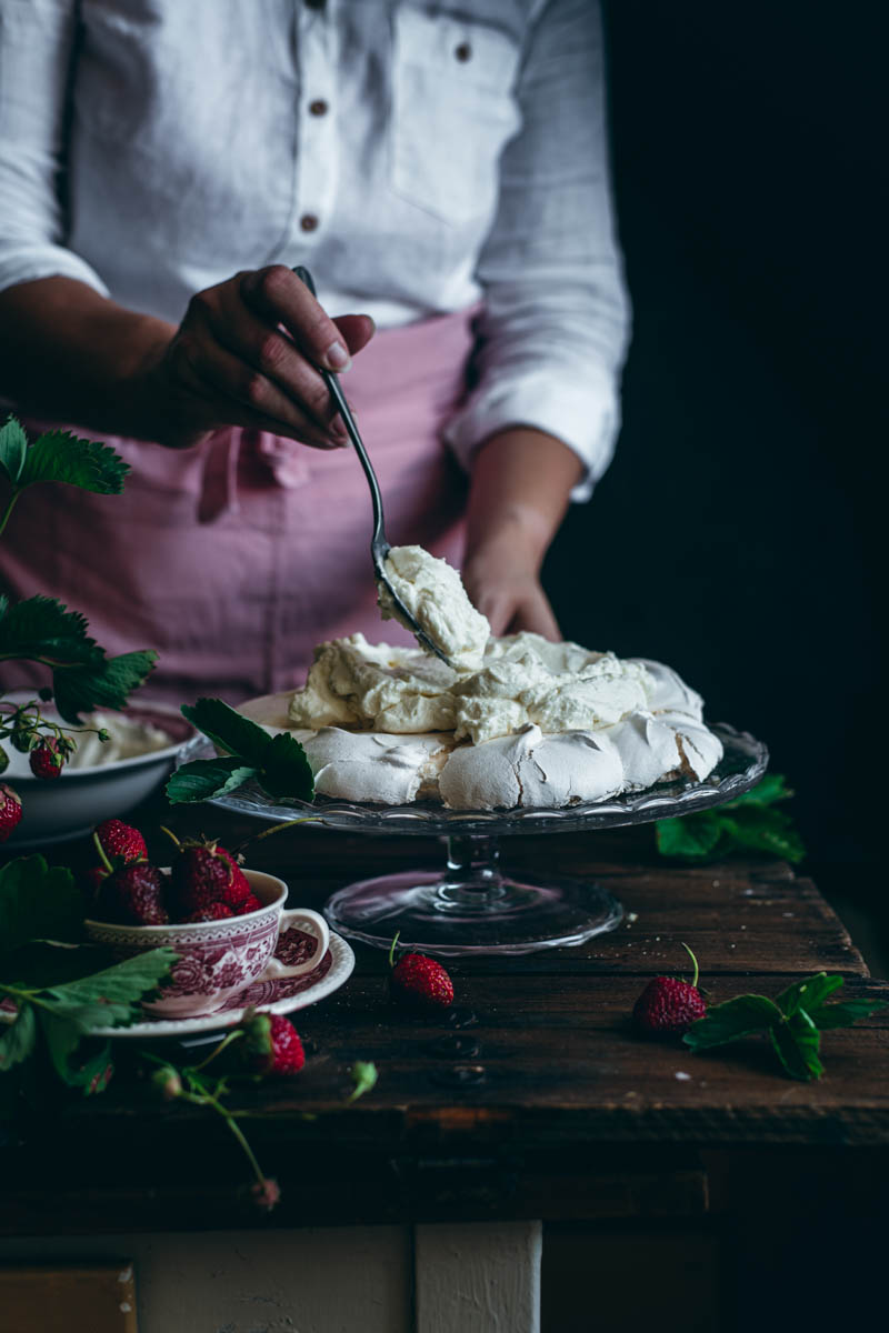 Místo klasické šlehačky jsem zvolila krém z mascarpone v kombinaci se šlehačkou a citronovým lemon curdem. Nakyslá chuť citronu, v kombinaci se sladkou a křupavou krustou sněhové Pavlovy a se sladkými jahodami je prostě nepřekonatelná.