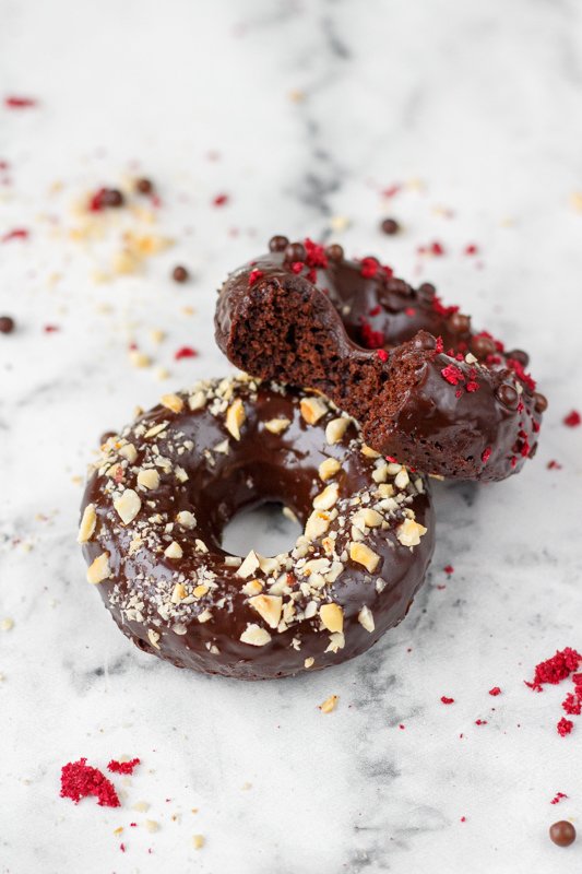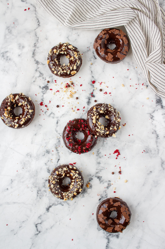 Tyhle donuty nejsou ani smažené, ani kynuté, zato jsou měkké a nadýchané jako obláček. I s přípravou, pečením a zdobením vám zaberou maximálně 30 minut. A těsto se dá upéct i ve formě na muffiny, pokud se vám nechce pořizovat tu s důlky na donuty (já si ji kdysi nechala nadělit k Vánocům). Nejvíc se mi na nich ovšem líbí, jak si můžu krásně vyhrát se zdobením. Tady jsem použila sekané lískové oříšky, čoko kuličky a drcené lyofilizované maliny, dětem určitě udělá radost i cukrový máček nebo mini lentilky.