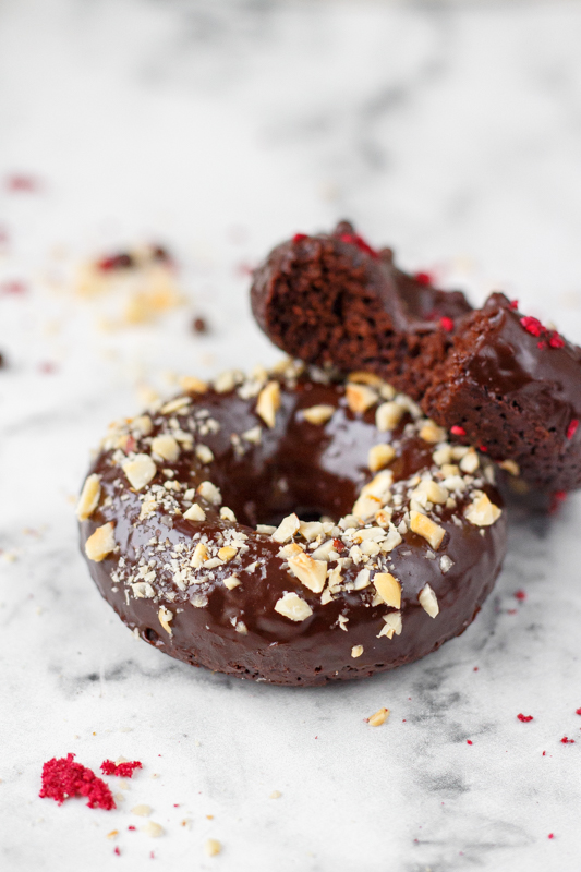 Troubu předehřejeme na 180 °C, formu na donuty vystříkáme olejem na pečení, případně vymažeme máslem a vysypeme hrubou moukou. V míse smícháme mouku, cukr, kakao, kypřící prášek, jedlou sodu a sůl. Zvlášť v misce metličkou prošleháme podmáslí, vejce, vanilku a ořechové máslo. Vše rychle smícháme dohromady, aby v těstě nebyly hrudky (pozor na přemíchání, donuty by byly tuhé). Těsto si přendáme do sáčku s ustřiženým růžkem a naplníme jím důlky na donuty do 2/3 výšky (forma na klasické donuty má 6 důlků, takže polovinu těsta necháme zatím stranou). Donuty pečeme 10 minut, poté je necháme 5 minut odpočinout, vyjmeme je opatrně z formy a necháme vychladnout na mřížce.