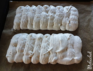 A takýto je postup: Bielky všľaháme do penista, pridáme cukor a šľaháme, kým nedosiahneme lesklú a pevnú konzistenciu. Nakoniec primiešame kukuričný škrob a nastrúhanú čokoládu. Penu naplníme do cukrárskeho zdobiaceho vrecúška a vytláčame penové pásiky na plech vystlaný papierom na pečenie.