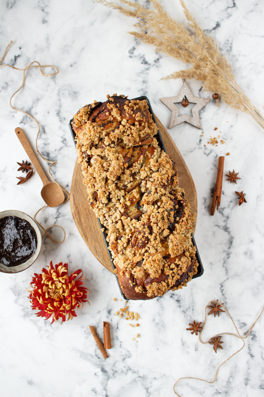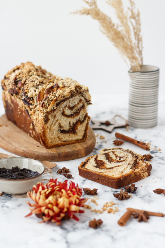 Dlouho jsem v hlavě nosila myšlenku na něco kynutého, voňavého, s chutí podzimu a nádechem zimy, co už bude připomínat Vánoce. Tak vznikla tahle podzimně-zimní babka. Voňavá po perníkovém koření a rumu, plná povidel a oříšků. Obvykle babku po upečení potírám cukrovým sirupem, lákala mě ale i verze s drobenkou. Ta má ovšem jeden háček. Těsta je hodně, během pečení vyběhne až nad formu, takže je třeba počítat s tím, že drobenka může trochu opadat na dno trouby. Proto se babka tentokrát před pečením potírá vajíčkem, aby drobenka lépe držela. Odměnou jsou ale křupavé oříškové kousky navrchu každého plátku babky. Mimochodem, na fotce to není vidět, protože jsem ukrojila plátek na kraji, kde jsou stočené konce těsta, ale jinak byla babka doslova proužkovaná povidly. Ideální poměr mezi náplní a těstem.