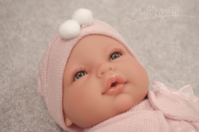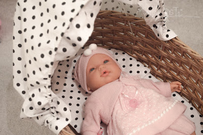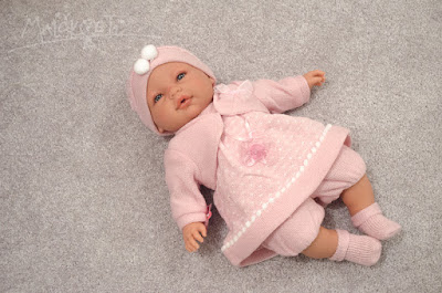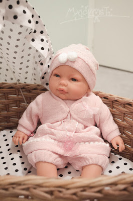 U nás letos dárek number one. Jsem přesvědčená o tom, že i kdyby pod větví nebylo vůbec nic dalšího, Madla bude nejšťastnější tvor na planetě. Divila jsem se, jak je dítě, které ještě samo cucá mlíko z prsu, schopné se s láskou starat o panenku, krmit z lahve, vozit v kočárku a přikrývat v postýlce peřinkou. Ale je to tak. Jásá nad každým obrázkem mrněte na obalu kojenecké vody a plenek. Když jsme na návštěvě, kde mají panenku-novorozence, okolní vesmír pro ni přestává existovat. A tak dostane od Ježíška vlastní. Už totiž dobrý měsíc chodí a všude vyřvává, že si přeje „mimíííí“. Vybrala jsem panenku Bimba od španělské značky Antonio Juan. Má 39cm, takže je podle mě velikostně ideální pro malé dítko. Váží navíc pouhých 450 gramů. Má měkké tělíčko, pouze končetiny jsou vinylové, takže je krásně ohebná, prostě k pomuchlání. Nemám ráda hračky na baterky a mrzelo mě, že všechny s měkkým bříškem měly nějakou „funkci“ navíc, ale tahle naštěstí jen pláče (a jde to vypnout!) a dudlíčkem se utiší, tak si myslím, že by se to mohlo líbit. Jak jsem alergická na růžovou, tak tenhle obleček mě prostě nadchl. Posuďte sami 🙂