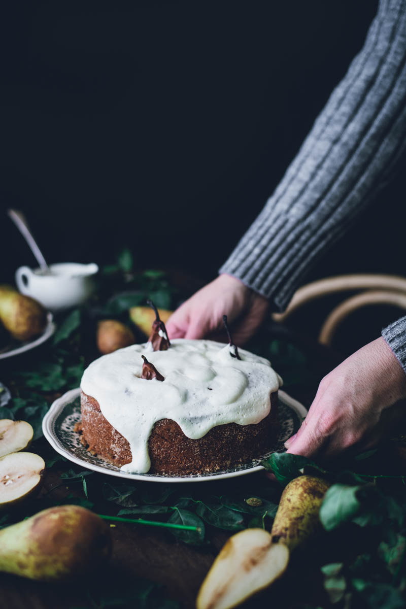 Hrušky jsem do koláče použila celé. V některých receptech se hrušky loupou a v jiných ne. Protože se mi podařilo koupit poměrně měkké hrušky, rozhodla jsem se slupku ponechat. V případě, že by byly hrušky tvrdší, doporučuji oloupat. Koláč jsem nakonec přelila polevou z mascarpone.