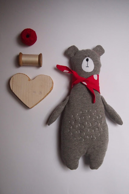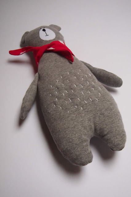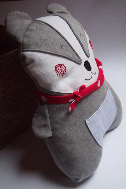 A tak jsem víceméně zachovala Mižďuší střih, použila šedý úplet a ušila jezevce. Nebo teda paní Jezevcovou. Sára totiž pod stromeček dostala knížku naší oblíbené Marianne Dubuc s názvem Horská cesta, která je právě o paní Jezevcové. Moc mě bavilo vyšívání čumáčku a hlavně líček - konečně jsem se naučila francouzské uzlíky.