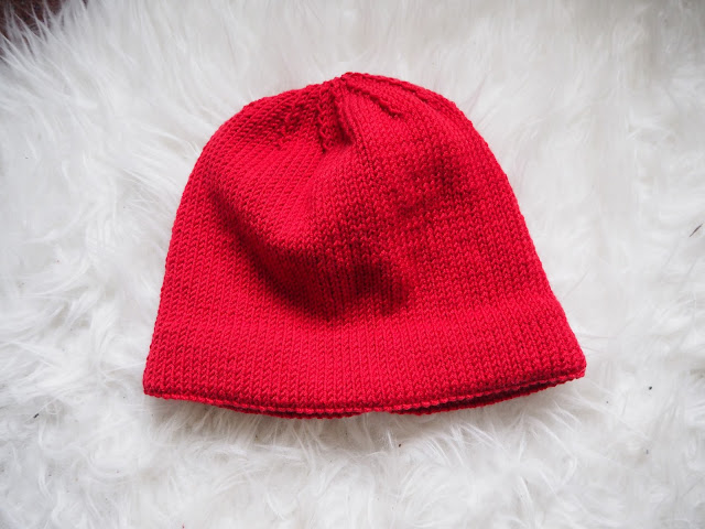 druhá letošní čepice a podruhé upletená. Červenou čepici jsem poprvé upletla pouze hladce (jen vroubky), ale nebylo to ono. Prý vypadá jako červený obvaz …