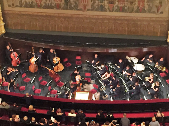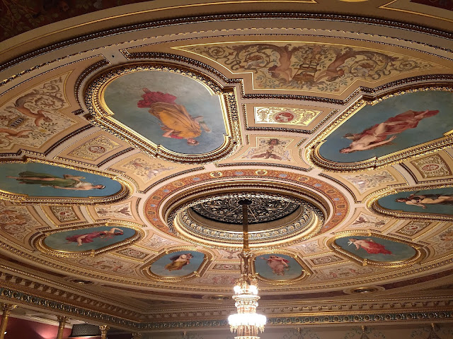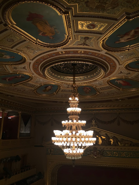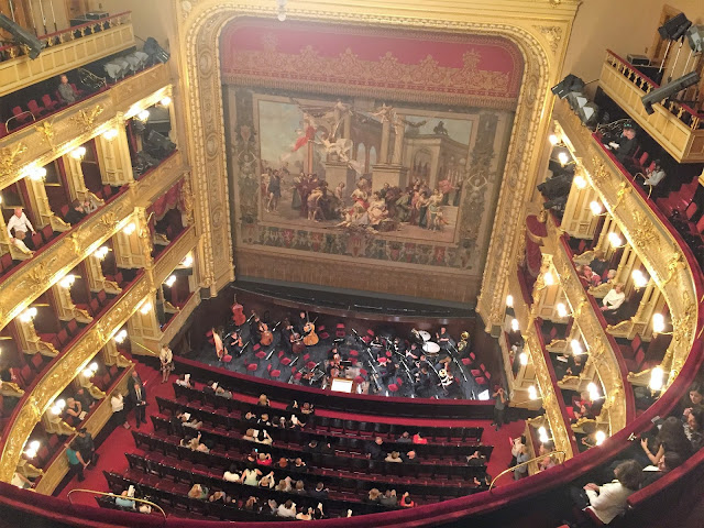 S dcerou hledáme nápis na Hynaisově oponě Národ sobě! Hledíme z druhé galerie z 1.řady dolů a dcera počítá členy orchestru. Napočítala jich 40 i s panem dirigentem. Zajímá ji, co znamená sekce dechových nástrojů, ukazuji pozouny, klarinety, trubky, příčné flétny, vlevo pak harfu, načež se stmívá, lidé tleskají, pan dirigent zvedá taktovku a krásná hudba Ludviga Minkuse nás přenese do doby romantismu a my sledujeme příběh nenaplněné lásky, zrady, přeludů a snů z exotického prostředí indického chrámu