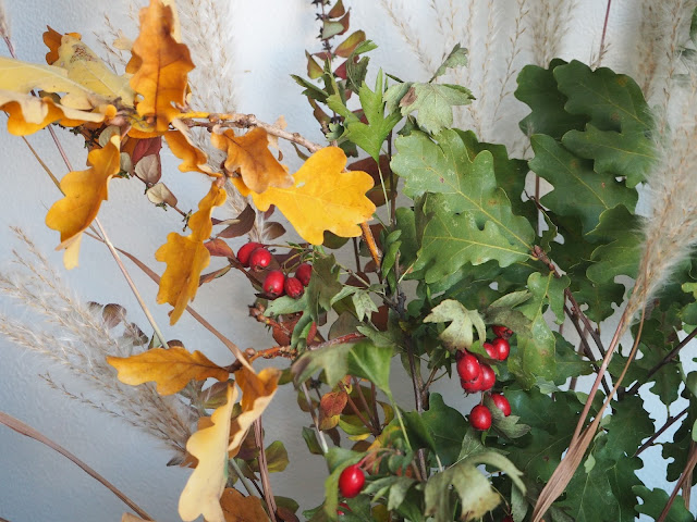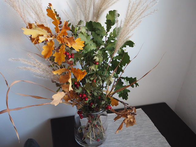 … k ní jsem přidala tu z minulého týdne, něco travin natrhala, něco přidal Bertík a máme v kuchyni podzim ve váze …