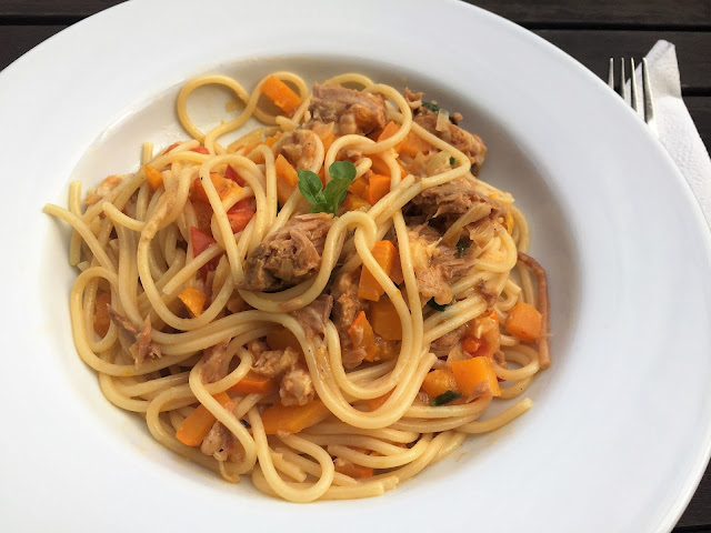 A když mne přepadne hlad, nabídneš mi plody, které uzrávají hojně ve Tvém čase…takže lze za pár desítek minut stvořit skvostné dílko z dýně hokaido, tuňáka, cibule, drobných rajčátek, česneku, špaget, soli, pepře a extra panenského oleje s příchutí pomeranče, ozdobené bazalkou s pár lehce poházenými kostičkami mozzarely…