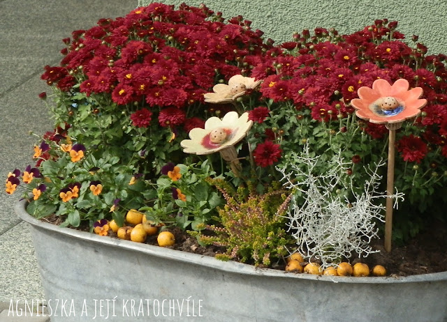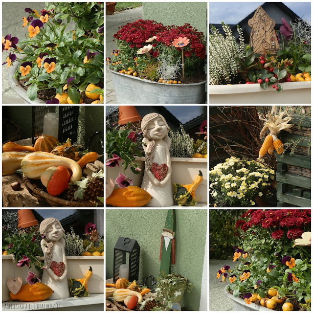 Výsledkem je podzimní výzdoba u vchodu do domu – kromě podzimního věnečku, který už jsem dělala dřív (líbí se mi i v té „nečerstvé“ podobě, je v něm teď více podzimní melancholie :-)), jsem osadila podzimními astrami, maceškami, drátovcem a vřesem plechovou vaničku.