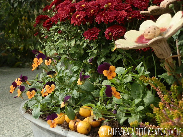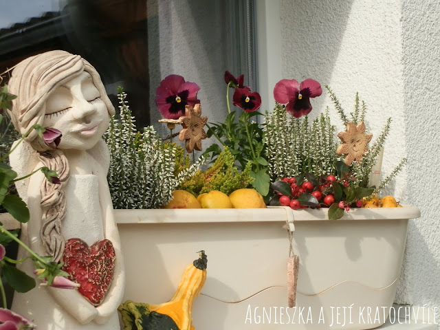 Nové obyvatele dostaly i truhlíky na spodním okně u vchodových dveří (vřesy, macešky, klikva), doplněné o milovanou keramiku (krásnou andělku mi vyrobila Renča, domečkový zápich a keramická srdíčka mám od Pavly – Lavender, květinové zápichy ve vaničce a keramické ptakoše pak od Zuzky Morkusovic).