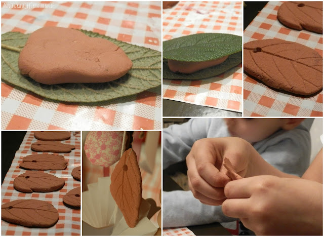 K výrobě lístečků jsme potřebovali kromě výše uvedeného listy kaliny vrásčitolisté (lze použít i listy jiných dřevin s výraznějším žilkováním). Po vytvarování přibližného tvaru lístečku z hmoty se tento tvar vloží mezi dva listy kaliny (žilkováním směrem k hlíně) a následně přejede válečkem (otisk listů tak bude z obou stran). Necháme vyschnout 1 den a můžeme ihned zavěsit nebo ještě nabarvit akrylovou barvou a vyrobit si lístečky barevné .-)