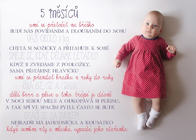 Nikdy mě nepřestane fascinovat, kolik je malý člověk schopen naučit se za první rok svého života. Na začátku je to mláďátko, které jen kouká (do blba) a divoce máchá ručičkama, v roce už téměř samostatný tvor schopný se bez pomoci přesouvat, krmit a komunikovat. A leckdy i dělat srandu! A to mezi tím, ty všechny malé pokroky, jsem si chtěla pamatovat. A ráda bych, aby o nich jednou věděla i Madlenka. Jen tak pro radost. Co se naučila, co ji bavilo a co rozplakávalo. Na Pinterestu jsem objevila zajímavý nápad s focením a zaznamenáváním dítěte v měsíčních intervalech. Neměla jsem k tomu sice žádné milníkové podložky, ale světlé prostěradlo na posteli posloužilo stejně dobře. Po nafocení jsem fotku upravila (hlavně šlo o vyhlazení okolí kolem miminka, aby lépe vyniklo) a pak přidala texty. Zvolila jsem tři druhy fontů, které se opakují ve všech dvanácti měsících. Barvy jsem měnila podle Madlenčina oblečení. Její pokroky jsem si pravidelně zaznamenávala do mobilu, kdykoli nějaký udělala, takže pak pro mě bylo jednoduché kalendář tvořit i několik měsíců zpětně (což tak ke konci i dopadalo, protože času je prostě méně a méně…) No a tady malá ukázka (jen z několika měsíců, ať vás nenudím) toho, jak to tedy dopadlo 🙂