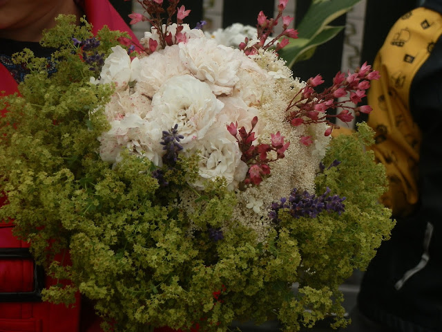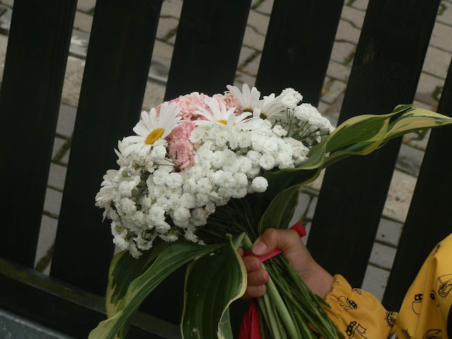 Kytičky pro paní učitelky ve školce a ve škole z vlastní produkce (kromě mnohakvětých růžiček ve středu kytic, kopretiny nebo hortenzie stromečkovité s několika snítkami levandulí a dlužich krvavých a jako lem kontryhel nebo řebříček bertrám s listy host).