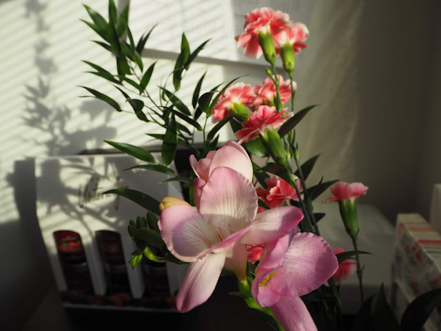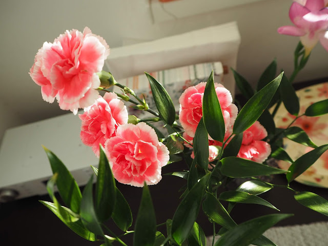 ... tyhle mini karafiátky drží i ve vedru - jsou i po 14 dnech pořád krásné - kytička od kamarádky, se kterou se známe opravdu od narození - je o 50 minut starší a určitě jsme vedle sebe ležely na vozíku v porodnici. Mamky spolu na pokoji byly ...