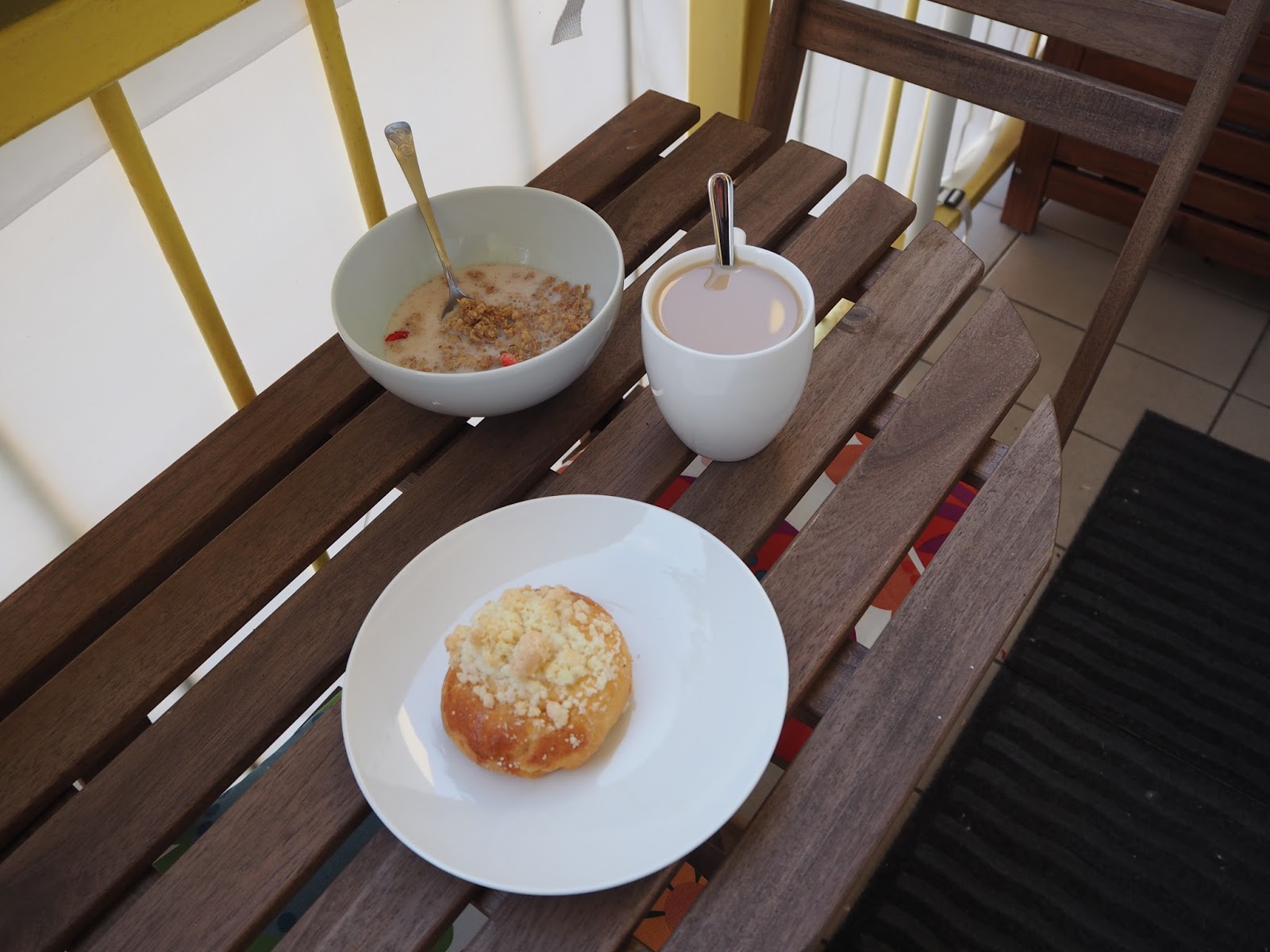 … je tam krásně čerstvě. Snídaně tam mi chutnala. Spojila jsem zdravý styl z nezdravým. Trochu granoly s jahodami a koláček z Naproti …